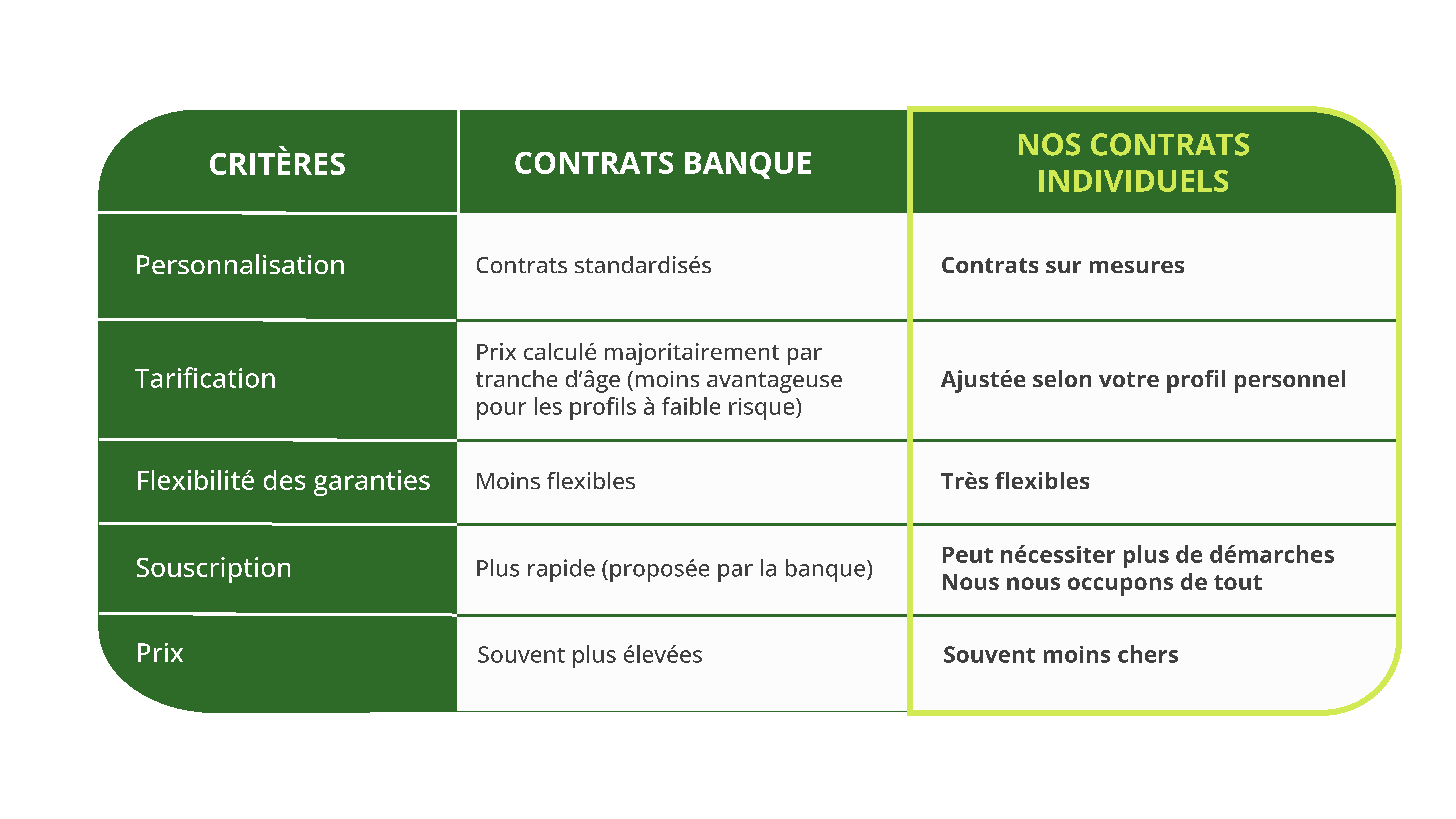 À l'inverse, l'assurance individuelle, souscrite auprès d'un assureur externe, permet une personnalisation de la couverture selon l'âge, l'état de santé et la profession de l'emprunteur. D'une part, cela se traduit généralement par d’importantes économies, tout en offrant des garanties mieux adaptées aux besoins réels. D'autre part, opter pour ce type d’assurance permet de bénéficier d'une meilleure protection à un coût potentiellement inférieur. De plus, AssuCrédit vous accompagne dans cette démarche en réalisant, le cas échéant, une étude personnalisée auprès de l'ensemble de ses partenaires afin de trouver la meilleure solution pour répondre à votre demande de couverture.